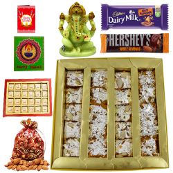 Deck the lives of the people closest to your heart with love by sending this Diwali Time Sweets Selection Gift Hamper that beautifully conveys the message of your heart to them. This Deepawali Hamper is presented with: 1. A Sweets Assortment Platter that holds Kaju Choco Ball (4pc), Kaju Butter Scotch Ball (4pc), Kaju Katori (4pc), Khajur Dry Fruit Laddoo (4pc), Sattoo Ladoo (1pc) and Kesaria Peda (6pc). 2. Cadbury Dairy Milk Roast Almond Chocolate Bar (36 gm) 3. Snickers Chocolate (25 gm) 4. Cadbury Nutties (30 gm) 5. 3 pc Tea Light Candles 6. Silver Plated Ganesh Laxmi Coin 7. A Free Diwali Card