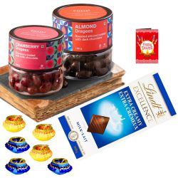 Make your dear one happy by sending this Sweet Touch Diwali Gift Hamper with your special feelings. This Diwali Hamper is loaded with - 1. 4pc Nestle Munch (20 gm each) 2. 2pc Snickers Bar (22 gm each) 3. 4 pc Ferrero Rocher (50 gm each) 4. Cadbury Silk Oreo Bar (60 gm) 5. 2pc Lotte Chocopie 6. 4 pc Tea Light Candle Light 7. A Ganesh Laxmi Mandap 8. A Reusable Handle Cane Basket 9. A Free Diwali Wishing Card