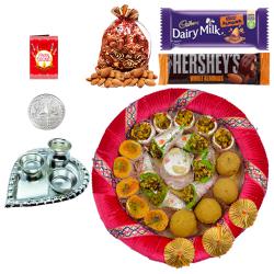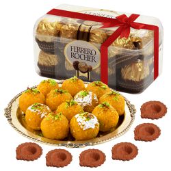 Win the hearts of your dear ones by this Ravishing Roll Baklava N Ferrero Rocher and show your fondness. This Box contains - 1. Roll Baklava (250 gm) 2. 3 pc Ferrero Rocher 3. Fancy Diya 4. Shubh Labh Wall Sticker Set 5. Silver Plated Ganesh Laxmi Coin 6. Free Diwali Card