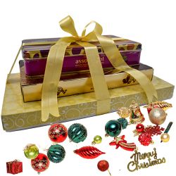 Impress your dear ones by sending this Exotic Xmas Special Chocolate Tower with Decoratives and elegantly brighten up their mood instantly. This Xmas Chocolate Tower is comprised of - 1. 16pcs Ferrero Rocher Moments Chocolate Box 2. Hersheys Kisses Exotic Dark Chocolate Coated Premium Fruits Box (120g) 3. Cadbury Celebration Assorted Chocolate Box (118g) 4. 16ps Ferrero Rocher Hazelnut Chocolates 5. A Box of Free Christmas Decorations is also added