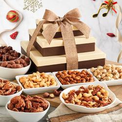Surprise your loved ones with this Heavenly Choco N Nuts Tower Treat Combo for Christmas and stay forever in their hearts. This Christmas gift tower is arranged with - 1. Hersheys Kisses Exotic Dark Chocolate Coated Premium Fruits Box (120g) 2. Mixed Dried Nuts (400g) 3. Salted Nuts (250g) 4. A box of free Xmas decoration is also added