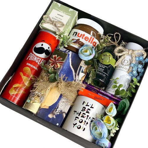 Order online this Pampering Gift Box for Men who deserve your love and special attention. This Gift Hamper is comprised with: 1. The Body Shop Oliive Shower Gel (250ml) 2. Denver Deodrant Spray 3. Nuttela Choco Spread 4. Sapphire Cookies Tin(150 gm) 5. 4pcs Ferrero Rocher Chocolates 6. Pringle Chips 7. A Scented Candle