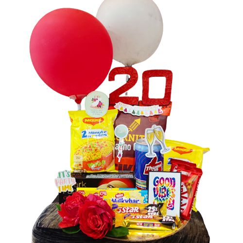 Gift this Awesome Chocolaty Assortment for Birthday and spread happiness. This Gift Hamper contains: 1. Cornatos Nachos 2. 2pkt Maggie Noodles 3. ITC Dark Fantacy Chocolate Filled Cookies 4. A Thumps Up Can 5. 2pc Nestle Milky Bar 6. 2pc Kitkat Bar of 4 fingers 7. 2pc Cadbury 5 Star Chocolate Bar 8. Decorative Balloons and Stickons