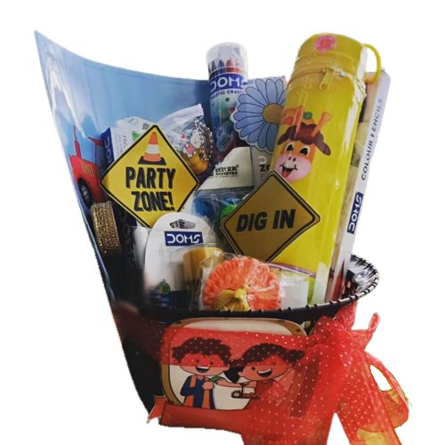 Gift this Wonderful Doms Coloring Kit Assortments for Kids and spread happiness. This Kids Gift Hamper contains: 1. 12pc Doms Crayons Color Set 2. 12pc Doms Pencil Color Stick Set 3. Doms Eraser cum Sharpener 4. 6pc Doms Synthetic Colour Set 5. A Pencil Holder Pouch 6. A Coloring Book 7. A Popit 8. Stickons 9. A Plastic Basket Container