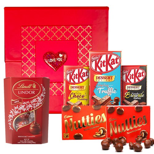 Impress your dear ones with this Chocolicious Valentines Day Hamper and make their faces glow with happiness. This gift box comes with: a) Lindt Lindor Chocolate Box (200 gm) b) 2pcs Cadbury Nutties (30 gm each) c) Nestle Dessert Delight (3 flavors) d) 10pcs Nestle Kit Kat(7.7 gm each) e) Red Color Box
