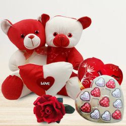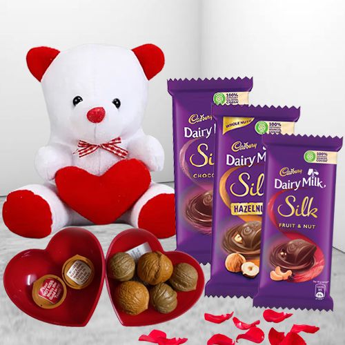 Let someone know that you have feelings for him/her by sending this Expressive Love Message Box, Teddy with Cadbury Silk and sweep them off their feet on Valentines Day. This romantic gift combo includes: - Customized Love Message in Heart Shape Box - A 6 inch Red N White Teddy with Heart - A Cadbury Dairy Milk Silk Chocolate Bar (60g) - A Cadbury Dairy Milk Silk Fruit and Nut Chocolate Bar (55g) - A Cadbury Dairy Milk Silk Hazelnut Chocolate Bar (58g)