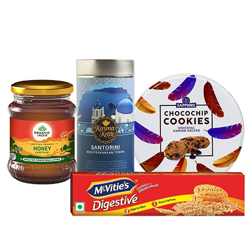 Click to deliver this Refreshing Tea with Cookies N Assortments Combo that delivers happiness instantly when unwrapped. This Tea hamper combo contains- a) Karma Kettle Santorini Tea (75 gm) b) Sapphire Chocochip Cookies (150 gm) c) Mc Vities Digestive Biscuit (250 gm) d) Indian Organic Honey Jar (250 gm)
