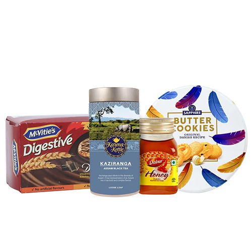 Pick this amazing Tea Time Treasures Gift Box for the dearest people in your life to make them feel special and loved. This combo hamper contains: a) Karma Kettle Kaziranga Tea (75 gm) b) Sapphire Butter Cookies (150 gm) c) Mc Vities Biscuit Dark Chocolate (200 gm) d) Dabur Honey (100 gm)