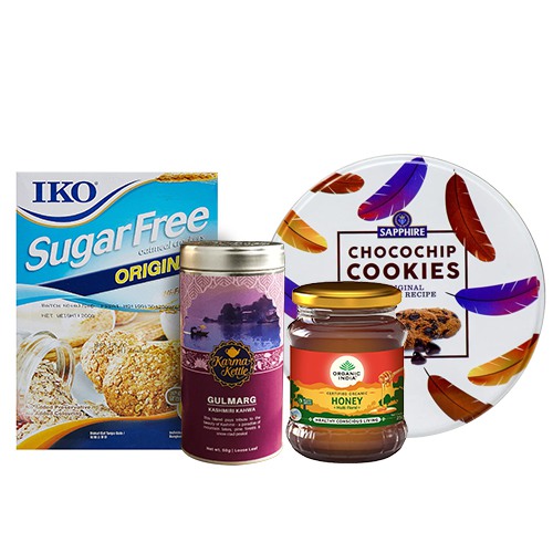 Order online this Alluring Gift Hamper of Gulmarg Tea with Assorted Treats and surprise your near and dear ones. This combo hamper contains: a) Karma Kettle Gulmarg Tea (50 gm) b) Sapphire Cookies (150 gm) c) Sugarfree Cookies (200 gm) d) Indian Organic Honey Jar (250 gm) e) Del Monte Green Olives (235 gm)
