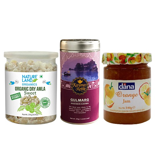 Present online this Sweet N Sour Amla Candy N Jam with Karma Kettle Gulmarg Tea for your loving dears and make them smile. This combo hamper contains: a) Karma Kettle Gulmarg Tea (50 gm) b) Dana Jam (315 gm) c) Amla Candy (250 gm)