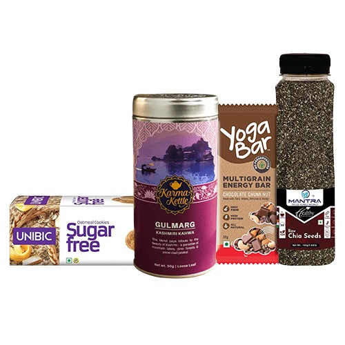 Gift this Blissful Gulmarg Tea Hamper to your loved ones and spread happiness. This combo hamper contains: a) Karma Kettle Gulmarg Tea (50 gm) b) Unibic Sugar Free Cookies c) Yoga Bar (38 gm) d) Mantra Raw Chia Seeds (175 gm)
