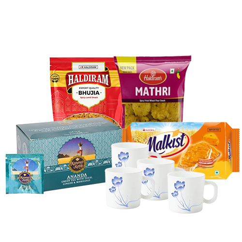 Order online this Marvelous Karma Kettle Ananda Tea with Savories N Cup Set for the people who deserve your love and special attention. This combo hamper contains: a) Karma Kettle Ananda Tea (25 Tea Bags) b) Haldiram Methi Mathri (200 gm) c) Haldiram Bhujia (200 gm) d) Malkist Crackers (138 gm) e) 4pc Cup Set