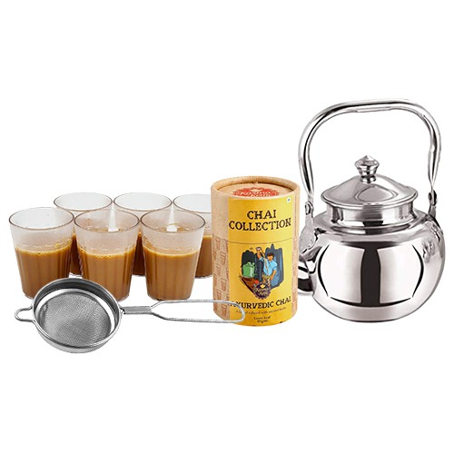 Gift this Authentic Karma Kettle Ayurvedic Tea Combo to keep your beloved smiling and happy. This combo hamper contains: a) Karma Kettle Ayurvedic Tea (50 gm) b) A Regular Stainless Steel Kettle c) Cutting Tea Glass (6 pc) d) A Strainer