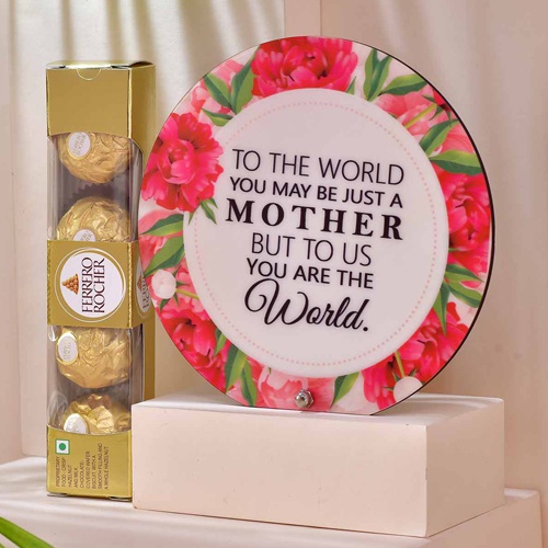 Pick this Beautiful My World Combo for Mom and send the essence of your gratification towards her on this Mothers Day. This gift combo has: a) MOM Loving Acrylic Momento b) Ferrero Rocher Chocolate (4pcs)