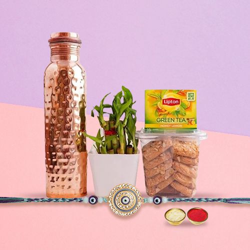 This gift combo contains: � An Evil Eye Rakhi by Rakhi Sutra (EVD300A) � A Hammered Copper Bottle � 2 Tier Bamboo Plant with Container � A Dry Fruit Cookies Pack � Green Tea 10 Tea Bags � Complimentary Roli Tika N Chawal � Complimentary Message Card with Free Rakhi