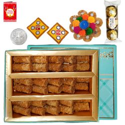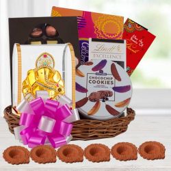 Opening this beautiful golden box, you will discover a delightful assortment of surprises. Prepare to be enchanted by the mesmerizing Golden Coin Chocolates, each one a delectable treat that is as rich in flavor as it is in elegance. Let the sweet aroma of our Ladoo Candle Set create an ambience of serenity and warmth, casting a soft glow that adds to the festive spirit.