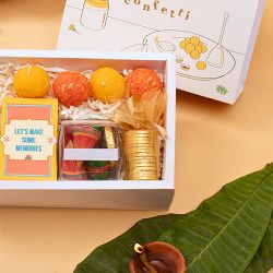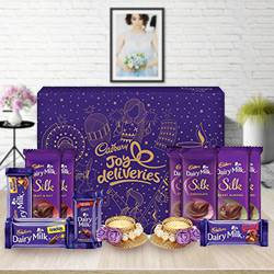 Experience the ultimate joy of Diwali with this delightful gift box. Treat yourself to a delectable assortment of Cadbury chocolates, beautifully complemented by handmade diyas to add a touch of traditional charm. And dont forget to spread the festive cheer with a heartfelt greetings card.