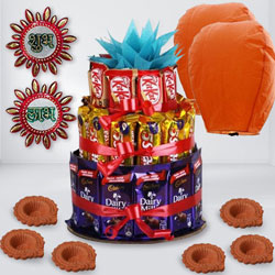 Send this Festive Fusion Chocolates Gift Box and make your dear ones feel truly special on this Diwali. This Diwali Gift Box has: � 2 Box Of Cadbury Celebrations Assorted Chocolates Box- 130.9 gms � 4 Pcs Cadbury Dairy Milk Chocolate - 13.2 gms each � 2 Pcs Cadbury 5 Star Chocolate -24 gms each � 1 Pc Cadbury Gems Chocolate Pouch- 17.4 gms � 2 Pcs Designer Handmade Clay Diyas