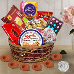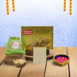 This Diwali Gift Hamper Has: � Designer Glowing Ganesh Idol � Cadbury Temptaions Almond Treat -1 Pc � Scented T-Light Candles - 10 Pcs � Designer Clay Diyas- Set Of 2
