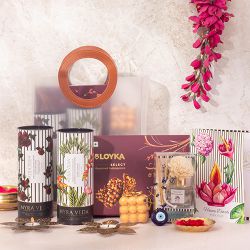 Indulge in the Special Diwali delight with this gift set that brings together a harmonious combination of Cadbury Celebrations Assorted Chocolates, a gold coin-shaped chocolate, and a heart-shaped chocolate box. But it doesnt stop there � this delightful hamper also includes a variety of gourmet nuts such as cashews, almonds, pistachios, and raisins. And to add to the festive ambiance, youll find a set of four designer clay diyas and a Happy Diwali card. All beautifully presented in a fancy tray, this gift set is perfect for spreading joy and sweetness during the festival of lights.