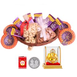 This Diwali gift hamper has: � Cashew 125gm � Almond 125gm � Pistachio 125gm � Raisins 125gms � 1 Pcs Designer T-Light Candle Set � All comes in a Designer Gift Box