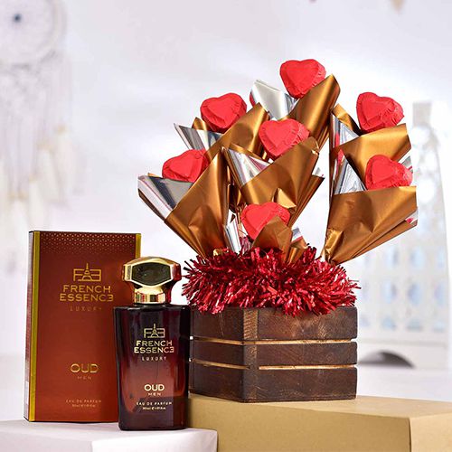 This valentine gift combo contains: � 7 Pcs Homemade Chocolates � Arranged in a Wooden Pot � French Essence Luxury OUD Parfum For Men(30 ml)