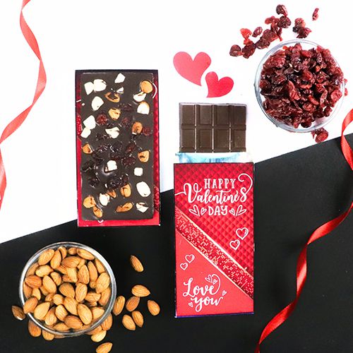 This Valentine gift hamper includes: � 100 Grams Chocolate Bar (Roasted DryFruits Filling N Cranberry Filling) � Wrapped in Valentines Theme Digital Print on Bar Box Top