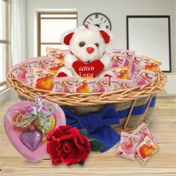 This chocolate gift box contains: � 1 Teddy � 2 Almond Florentines � 2 Lollipop � 1 Cookie Tin � Almond Cranberry Granola � 54.4% Dark Belgian Chocolate Almond Bar (40 Gms) � 1 Tin Hot Chocolate Classic � 1 Heart Shape Chocolate