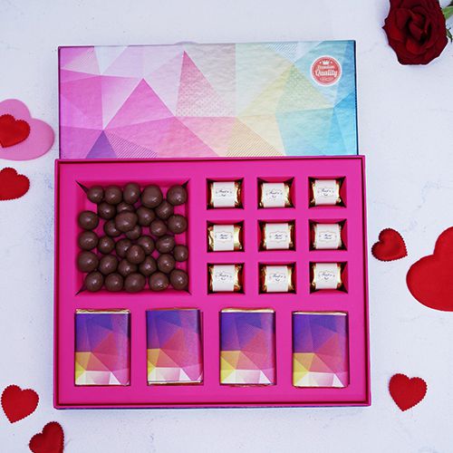 Let the sweet symphony of flavors dance on your taste buds with our collection of assorted chocolates and hazelnut delights. This gift box is a harmonious blend of 3 delectable assorted flavored chocolates - from the nutty delight of roasted almond to the fruity goodness of fruit n nut, and the sweet allure of butterscotch. Indulge in the smooth and velvety notes of 4 chocolate bars, featuring 2 bursts of refreshing orange and 2 rich and dark chocolate flavors. And dont forget the star of the show - our hazelnut dragees, offering a captivating combination of crunchy and creamy. Treat yourself or delight someone special with this symphony of flavors.