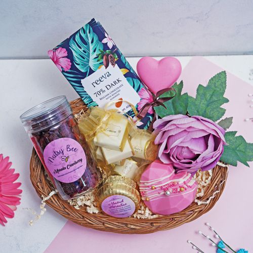 The basket consists of: � 70% dark belgian chocolate with roasted almond bar (40 gms) � 1 heart shape chocolate lollipop � 1 heart shape hot chocolate pi�ata � 2 almond florentines � 6 assorted chocolates � 1 bottle masala cranberry (120gms)
