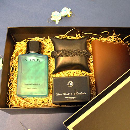 This gift box contains: � Versus EDP (100 ml) � Handcrafted Lime Basil N Mandarin Soap (125 gms) � A Bracelet for Men � A Genuine Leather Passport Cover