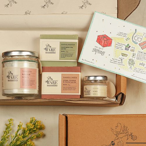 This gift hamper contains: � Terracotta Body Scrub - Natural Vitamin C Green Gram Flour Scrub � Rhassoul Dazzle - Orange Cinnamon Handmade N Cold Processed Soap � Soothe Operator - Green Clay Rose Handmade N Cold Processed Soap � Busy Bee Lip Balm - Natural Honey Vanilla Lip Balm