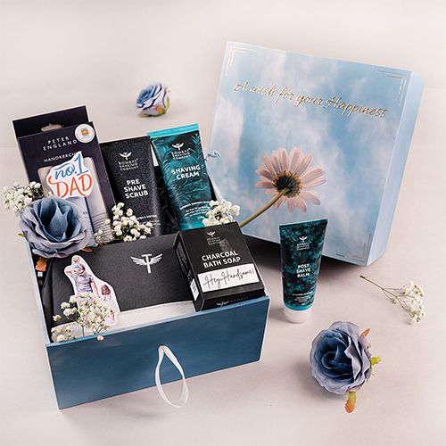 This gift box contains: � Reusable box � Shaving Cream from Bombay Shaving Company � Pre-Shave Scrub from Bombay Shaving Company � Post-Shave Balm from Bombay Shaving Company � Charcoal Bath Soap from Bombay Shaving Company � Shaving bag from Bombay Shaving Company � Handkerchief Set from Peter England � Personalized messages/photocards � Floral decoration