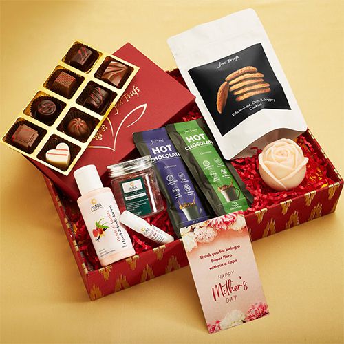 Step into a sanctuary of sweet serenity with the Mother�s Day Pamper and Treat Hamper. Every item in this box is carefully curated to create a perfect escape into luxury. Indulge in a delightful selection of 8 classic truffles with flavors ranging from Heavenly Milk to Strawberry Melody. These are paired with healthy, guilt-free wholewheat and oats cookies, free from refined sugar and flour, to delight your senses. Enjoy peaceful moments with our Ready to Drink or Serve Hot Chocolate Mix, available in Milk with Cinnamon and Vegan Cinnamon variants. Your skin will adore the touch of our Shea butter peach N vanilla body lotion, while our nourishing chocolate lip balm ensures your lips stay soft and supple. Soothe and refresh with our cool Aloe vera gel, and light up the lovely rose-shaped candle for a calming ambiance. This box is the ultimate gift for a beloved Mother or anyone who deserves a moment of pure relaxation and indulgence.