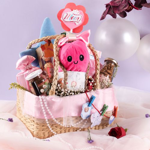 Delight an expecting mother with our charming Mom-to-be gift basket designed for both comfort and joy! This delightful package, encased in a reusable Water Reed basket, features a Mom to be sash for her special journey. Sweet stuffed toys add cheerful vibes while the Body Shop shower gel ensures relaxing showers. A splash of Faces Canada lipstick brightens her day, and a soothing scented candle fills the room with tranquility. Treat her to a pack of Ferrero Rocher chocolates and Nykaa nail paint for a touch of glamour. Inside, find Country Bean Coffee to energize her mornings, alongside Zaras womens perfume for a fresh scent. A dry fruit jar and Hersheys Kisses are perfect munching pleasures, and Moms Co products�stretch mark oil and foot cream�promise tender skin care. Each basket includes heartfelt greeting cards and customizable photo messages, crowned with lovely floral and net decoration for an exquisite touch.