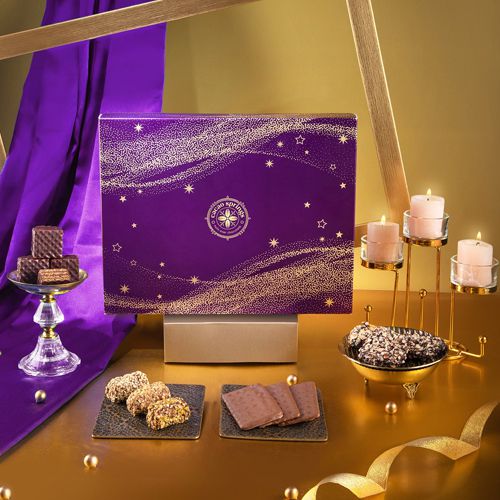 Experience the joy of giving with our Joyful Treats Gift Box, an enticing collection of chocolate and nut delights meant to elevate any celebration. Treat yourself and your guests to the rich flavors of Brittles, where crunchy meets buttery bliss, each layered in divine chocolate. Discover our signature Roca, an indulgent nutty toffee wrapped in chocolate luxury. Crisp Waffrils offer a unique bite, combining light wafers with a smooth chocolate coating. And for the coffee lovers, our Coffee Cookies provide a perfectly balanced aromatic crunch. This box is designed to deliver smiles and sweet memories for all.