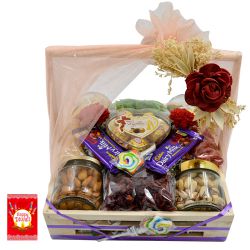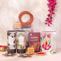 This gift consists of: � Almonds (50g) � Cashews (50g) � Pistachios (50g) � Yellow Toran � Brass Kamal Diya � Laddoo Candle Set of 4 � Matte Orange Stainless Steel Bottle (500ml) � A Reusable Blue Botanic Box