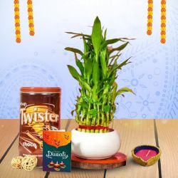 This gift box contains: � A Bottle of Body Wash (100 ml) � A Bottle of Body Lotion (100 ml) � Khatta Mitha Snacks � Millets Mixture Snacks � Cracker Shape Chocolates � Diwali Card � MDF Tray