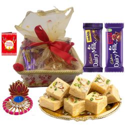 This gift box contains: � A Bottle of Shampoo (100 ml) � A Bottle of Hair Oil (100 ml) � A Bottle of Body Lotion (100 ml) � Cracker Shape Chocolates � Handcrafted Soap � 2 pc Flower Shape Candles � Diwali Card � Celebration Box