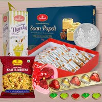 Hamper of Ganesh Lakshmi with 1 kg Kaju Kesar Katli from Haldiram with free Diya and silver plated coin