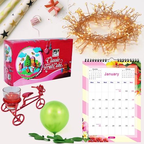 Make your New Year celebrations grander with this Fabulous New Year Hamper with Enormous Happiness that instantly rejuvenates everyones mood. This phenomenal Hamper is loaded with various delightful gift items such as New Year Cake, Desk Calender, a Wall Calender, Balloons are also included in this Hamper.