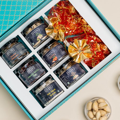 Gift this Delectable Tripling of Assorted Mukhwas with Chocolaty Bite N Nuts to your loved ones and spread happiness. This gift pack contains: a) Bombay Special Paan (50g) b) Khatta Chuhara (50g) c) Aam Papad Pachak (50g) d) Roasted Kaju (50g) e) Roasted Almond (50g) f) Roasted Pista (50g) g) 2 beautiful pouches of Chocolate Bites (5 Chocolate Bites Inside Each Pouch)