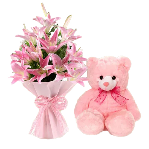 Immerse your dear one in the ocean of love by sending this Another Name of Love Valentine Duo and make him/her feel at the top-of-the world on this Valentine's day. This Valentine Duo features an extremely gorgeous Bouquet of 6 Oriental Pink Lilies and a lovable 6 inch Teddy.