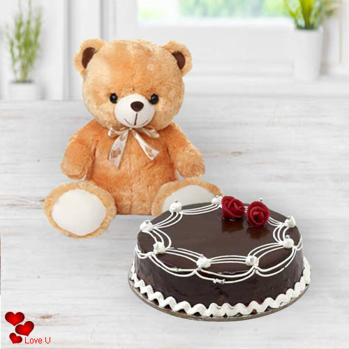 Bring people you love, closer to you by gifting them this yummy � Kg Chocolate Cake with 12� Cute Teddy that will create a magical spell of your lovely feelings upon them.