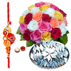 This gift set has: � 2 Dairy Milk Silk � A Bhaiya Bhabhi Rakhi � 2 Pink Roses � Free Rakhi Card � Roli Tilak and Chawal