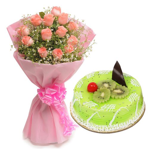 Send this Bouquet of 10 Pink Roses with 1 kg Kiwi Cake for Mothers Day & make your Mom smile.
