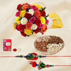 This gift set has: � 250 gms Assorted Dry Fruits � 5 pcs Cadburys Dairy Milk Chocolate bar (13gms each) � A Fancy Rakhi � Free Roli Tika Chawal included