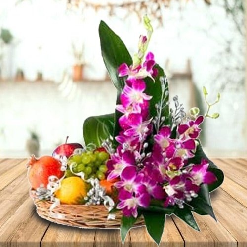 Fresh Fruits ( 2 Kgs.) Basket decorated with Exotic Fresh Flowers - This basket contains extremely high quality fruits like grapes,oranges,pomegranates etc which is decorated with exotic orchids and beautifully arranged in a bamboo basket.