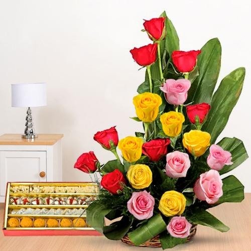 Deliver our Arrangement of 20 Enthralling Mixed Roses with 500 Gms Delicious Assorted Sweets and give your special ones a sensational surprise. They will treasure this superb gift at a terrific value you will love.