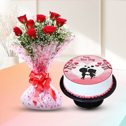 Convey your message of love in the best possible way with this gift of 1 lb Sensational Kiss Day Photo Cake with 8 Red Roses Hand Bouquet to fill the life of your loved ones with happiness on this love Valentines Week.